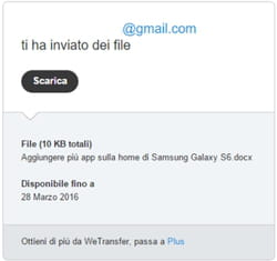 Una volta inviato uno o più file dal sito web, i destinatari riceveranno un messaggio da WeTransfer, in cui sarà notificato l'invio messaggio. Nella mail, i destinatari troveranno un link download, per poter caricare il file: