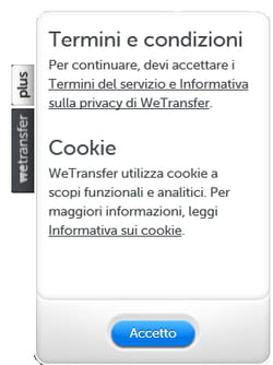 WeTransfer. Dopo la presentazione iniziale sarà richiesto di accettare i termini e le condizioni d’uso e la politica sui cookie We Transfer. Cliccare su