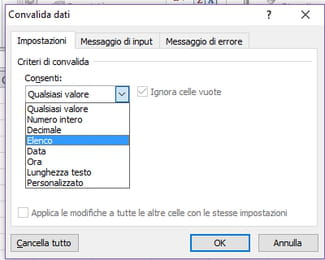No, numeri e date). Tornando al foglio di lavoro fare clic sulla cella o sulle celle che si desiderano convalidare e poi entrare nella scheda