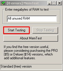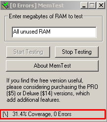 La versione gratuita del programma MemTest permette di eseguire un test dei moduli RAM da Windows. È semplicissimo da usare ma sembra meno efficace che Memtest86+, dato che esegue il test solo della memoria
