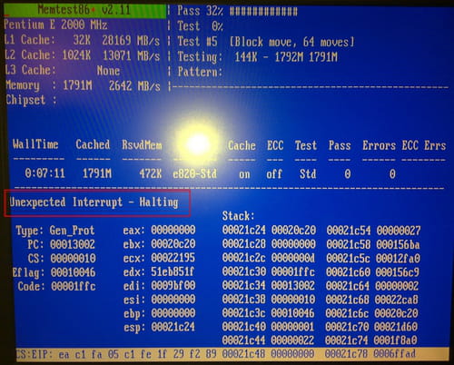 Unexpected Interrupt - Halting come mostrato nel riquadro rosso nell'immagine qui sotto, che indica un errore nel test stesso. È necessario in questo caso, ricominciare l'intera analisi per essere sicuro del risultato finale: