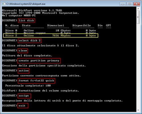 per visualizzare l'elenco dei dischi collegati al computer. Ricordare il numero della chiavetta (nell'esempio qui sotto il numero è