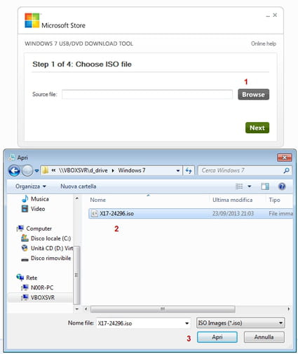 Browse, quindi trovare il file ISO, selezionarlo, poi cliccare