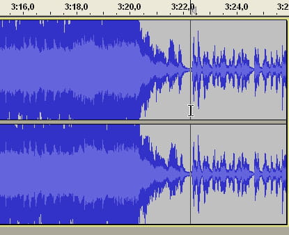 Adesso bisogna individuare la parte da tagliare. Andiamo verso la fine della canzone (è dove l'onda è più fine o va a sparire di solito), potete cliccate su un punto e schiacciare