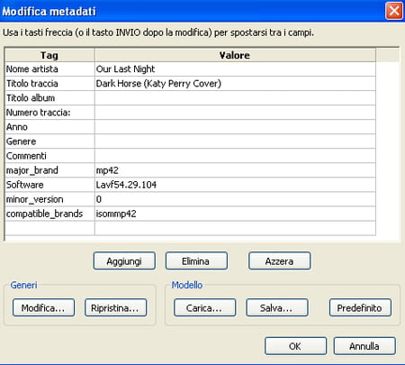 Ci si presenta davanti una finestra per modificare i metadati. Trattasi delle informazioni che verranno poi visualizzate tramite i lettori multimediali come