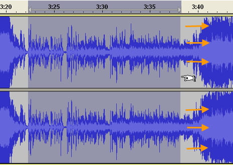 Dopo aver trovato il punto esatto andiamo a selezionare tutta la parte che vogliamo cancellare, andando vicino al punto di selezione, dove il puntatore cambierà forma, diventando una manina che punta verso sinistra. Da qui teniamo premuto click sinistro e andiamo verso destra (la fine del brano):
