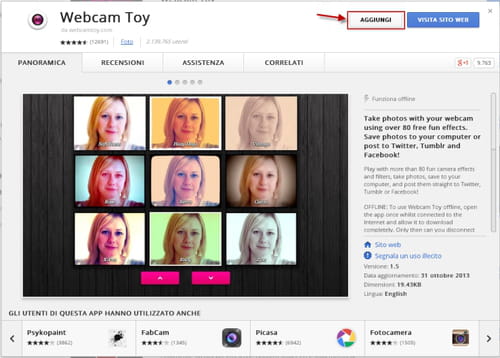Webcam Toy è un'estensione di Google Chrome che consente di utilizzare la webcam del laptop per scattare foto e inserire tanti effetti differenti per creare immagini divertenti, da conservare sulla memoria del PC o da condividere su Twitter, Facebook, Tumblr.
