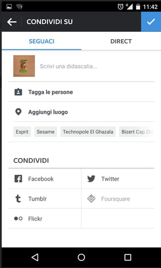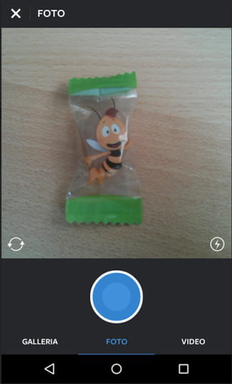 Instagram. Con questa app, infatti, è possibile scattare foto direttamente utilizzando l'app, cliccando sul tasto blu centrale o scegliere una foto dalla propria galleria, cliccando sul tasto in basso a sinistra (attenzione a riposizionare la foto, dato che le foto Instagram sono quadrate), o sarà anche possibile realizzare un mini-film (cliccando sul tasto in basso a destra). Qui si è deciso di scattare una foto direttamente dall'app: