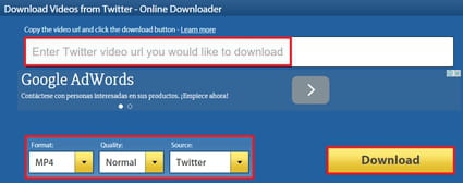 Download Twitter Video e inserirlo nel campo dedito. Selezionare il formato (ad esempio MP4), la qualità e la fonte (Twitter), poi cliccare sul tasto